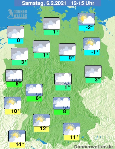 Heute Nachmittag bleibt es in einem breiten Streifen von NRW bis nach Sachsen bedeckt und hier fällt zeitweise Regen, Schneeregen oder Schnee. Im übrigen Bundesgebiet ist es teils stark, teils aufgelockert bewölkt, dabei fällt nur selten etwas Regen, Schneeregen oder Schnee. Die Temperatur steigt auf -2 Grad an der Müritz und bis zu 14 Grad im Breisgau.