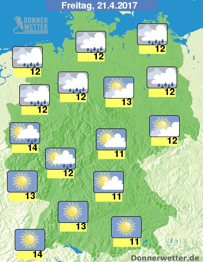 Am Samstag erreicht der Regen auch den Süden, sonst fallen bei mehr Wolken als Sonne örtlich Schauer. Auf den Bergen kann es dabei auch wieder schneien. Nur im Südwesten und an der Grenze zu Holland sind Schauer selten.