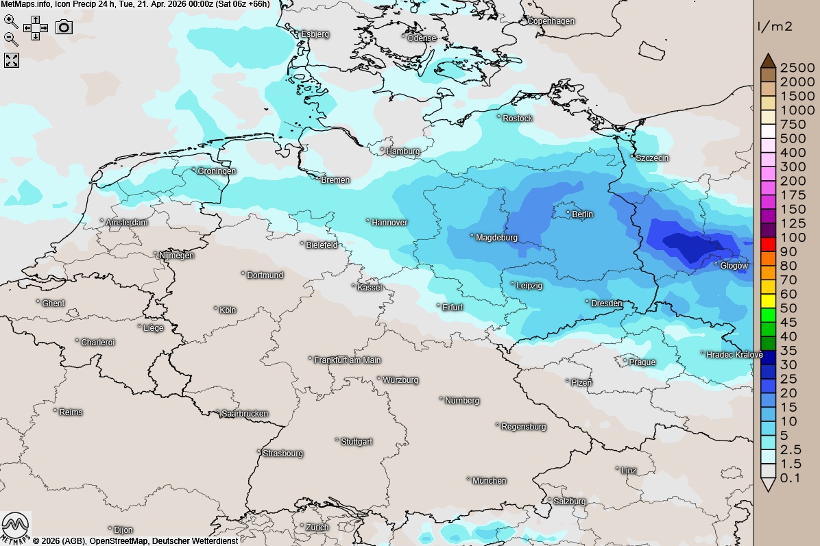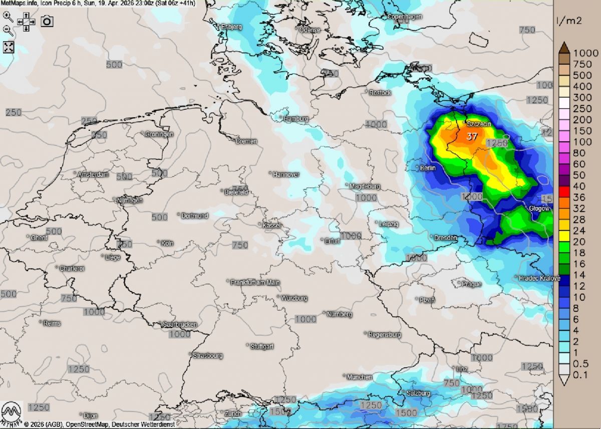 Die Wetterkarte für 06:00 Uhr, die Lufttemperaturen für 15:00 Uhr und die 24-Stunden-Regenmengen für Sonntag nach ICON: