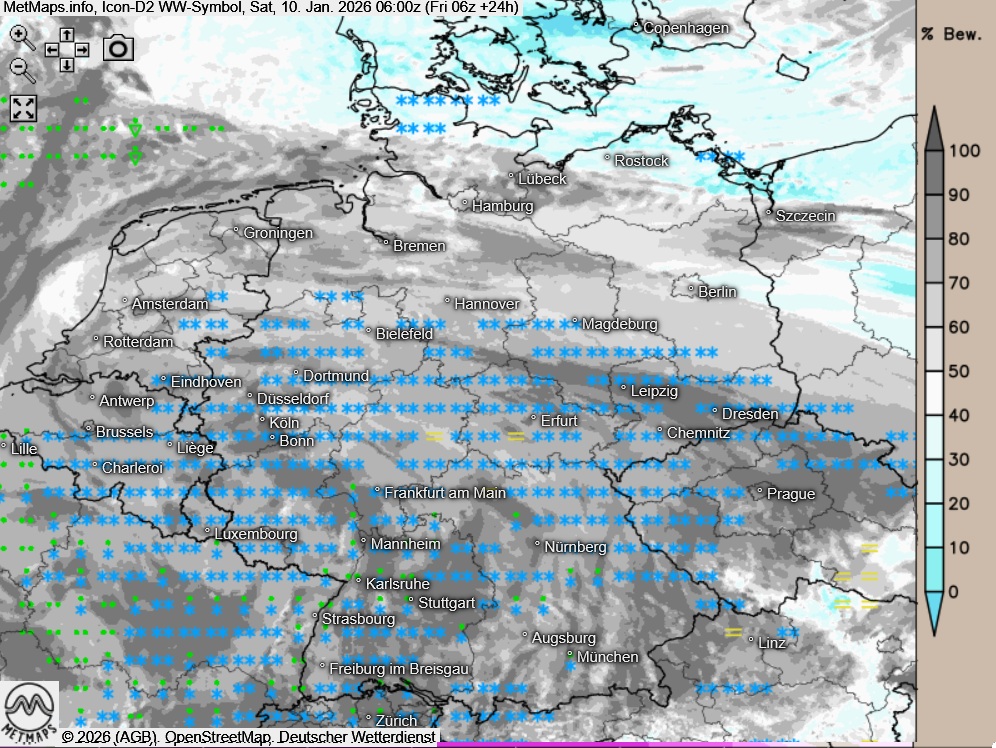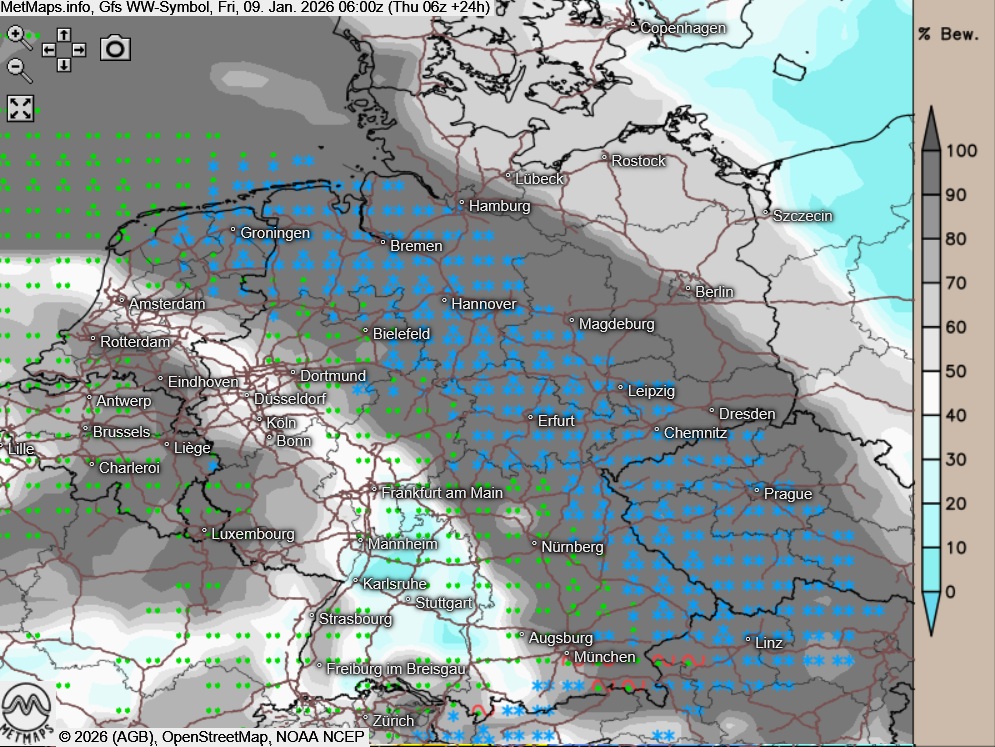 Am Freitag zeigt sich der Himmel über weiten Landesteilen stark bewölkt oder bedeckt, Auflockerungen beschränken sich auf das Ostseeumfeld sowie den äußersten Süden Deutschlands. Dabei muss mit teils ergiebigen Niederschlägen gerechnet werden - im Norden und Osten sowie im Bergland fallen diese zumeist als meist Schnee mit lokalen Verwehungen, in tieferen Lagen Regen, teils auch gefrierend.