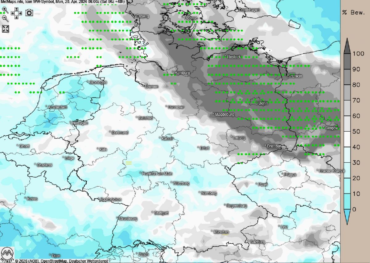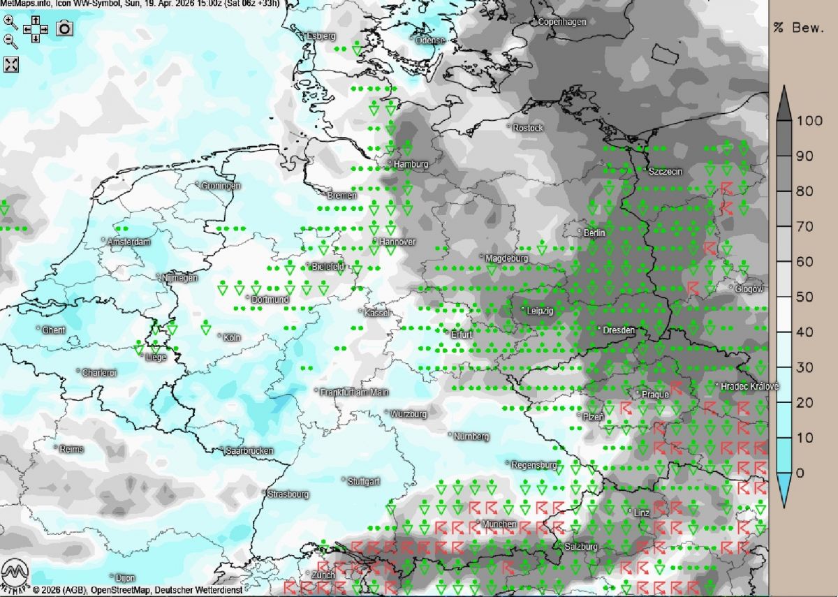 Am Sonntag zeigt sich der Himmel über dem Süden und Südosten anfangs stark bewölkt, dabei muss zeitweise mit Schauern und einzelnen Gewitter gerechnet werden. In den übrigen Landesteilen ist es teils stark, teils aufgelockert bewölkt und es fallen zeit- und gebietsweise Schauer.