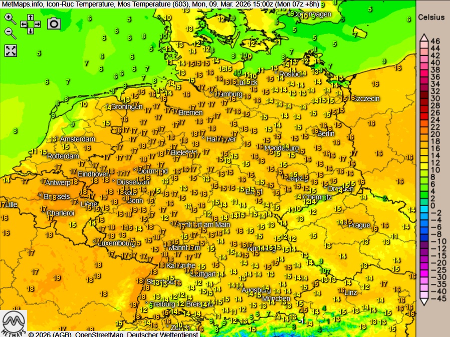 Die Temperatur- / und Wetterkarte für 15:00 Uhr sowie die 6-Stunden-Regenmengen bis 21:00 Uhr nach Icon-Ruc: