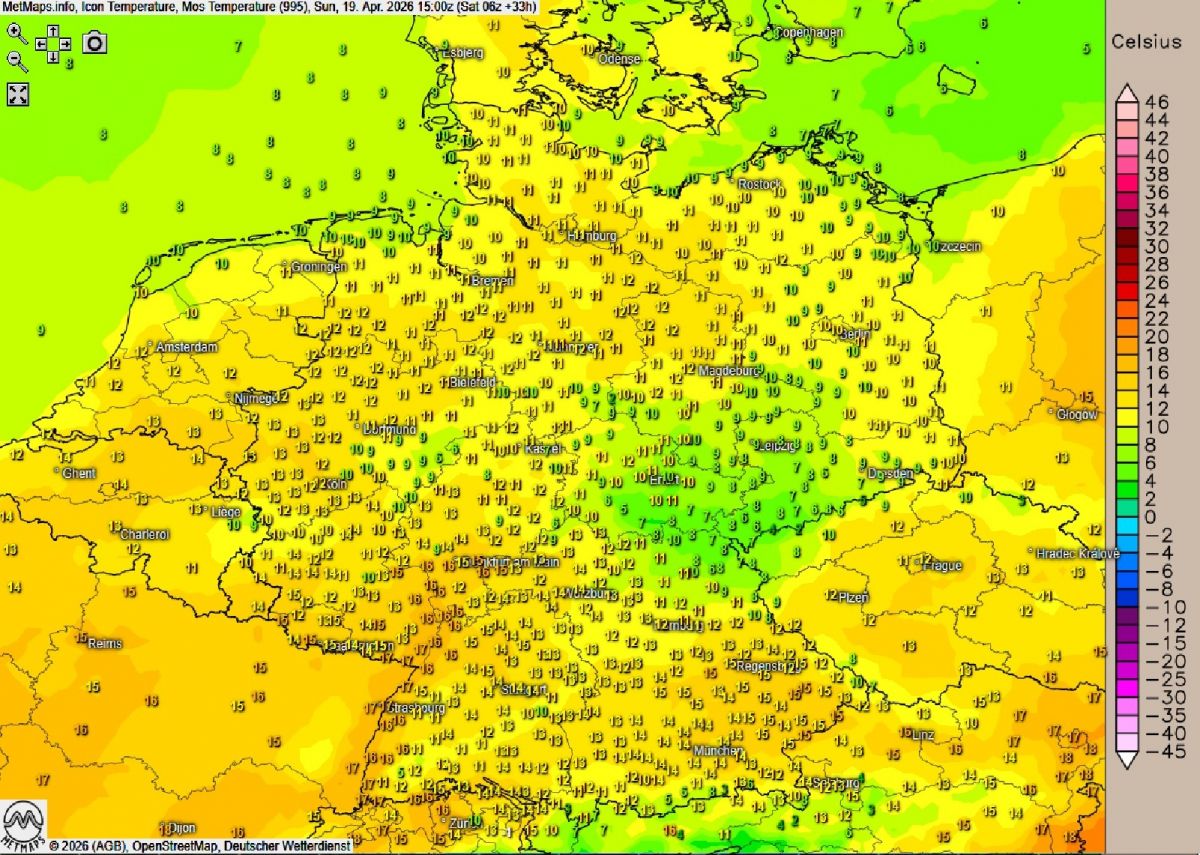 Am Sonntag im Süden und Südosten anfangs stark bewölkt, dabei zeitweise Schauer und einzelne Gewitter. In den übrigen Landesteilen teils stark, teils aufgelockert bewölkt und Schauer. Höchsttemperaturen um 10 bis 18 Grad.