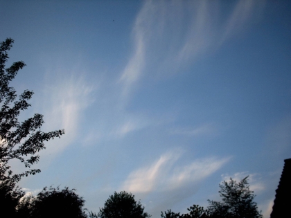 "Zu sehen sind Cirrus spissatus-Wolken und ganz unten rechts im Bild letzte Zipfel einer Cumuluswolke. Eine Cirrus spissatus-Wolke ist ein Eis-""Wattebausch"" in 6-9 km Höhe."