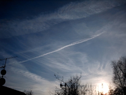 Das Bild zeigt Cirrus-und Cirrusstratuswolken. Zudem sind wieder Kondensstreifen zu sehen. Wenn die Bewölkung von Südwesten her aufzieht, kann es auf eine Wetteränderung hindeuten.