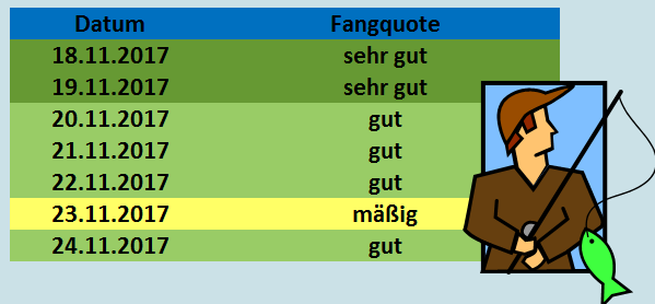 Der Situation anpassen sollte man nun die Fangköder. Wer in den nächsten Tagen mit tiefschwimmenden Ködern arbeitet, für den stehen die Chancen gar nicht mal so schlecht, einen "dicken Fisch" an Land zu ziehen. Zu verdanken sind die gute Fangchancen unter anderem aber auch den wechselhaften Wetterverhältnissen mit wenig Lichteinfall sowie der Neumondphase am Samstag.
