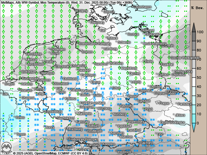Die Temperaturabweichung in 850 hPa sowie die Wetterkarte für die Nacht auf dem 31. Dezember nach AIFS: