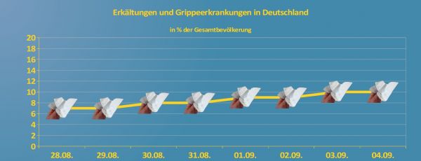 Die Erkältungs- und Grippezahlen steigen in den ersten Septembertagen an - verantwortlich dafür ist das zeitweise wechselhafte und nur mäßig warme Wetter.