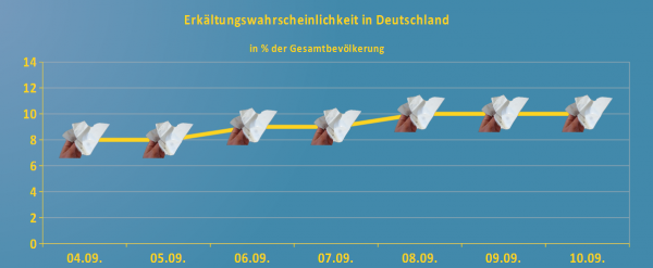 Bis Ende der ersten Septemberwoche klagen bis zu 10% der Deutschen über erkältungstypische Symptome - denken Sie in diesem Zusammenhang an die anstehende Auffrischung Ihrer Grippeschutzimpfung im September oder Oktober!