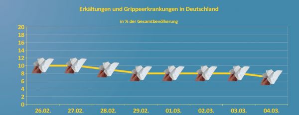 Gute Nachrichten zu Wochenbeginn: Die Erkältungs- und Grippezahlen sinken in dieser Woche kontinuierlich ab. Die "Hauptwelle" ist für dieses Jahr durch.