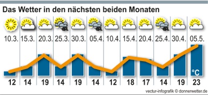 Mit dem März stabilisiert sich die Wetterlage. Wir erwarten einen tendenziell zu sonnigen und zu trockenen Monat; und auch die Temperaturen werden sich leicht über dem monatlichen Mittel bewegen.