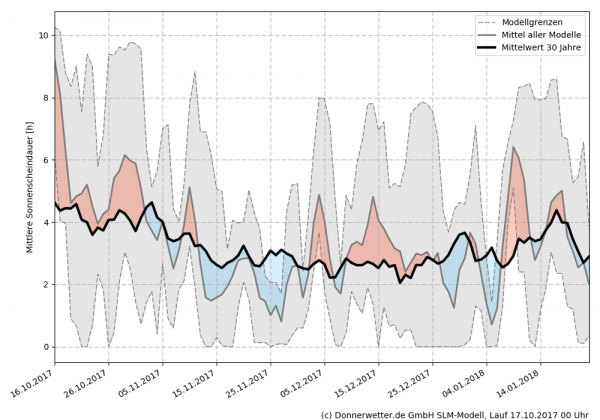 Temperaturen, die seltenen Niederschläge und vor allem die hohe Zahl der zu erwartenden Sonnenstunden dürfte Freunden des goldenen Herbstes in den kommenden beiden Wochen in die Karten spielen. Danach bewegt sich das Tagestemperaturmittel häufig über dem langjährigen Durchschnitt, vor allem bei den Niederschlagsmengen kündigt sich Wechselhaftigkeit an. Längere sonnige Phasen gibt es nach aktuellem Stand dann wieder verteilt über den Dezember.