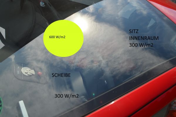 Auf unserem Bild oben scheint die Sonne mit einer Leistung von 600 W/m². Davon kommen im Innnenraum - je nach Modell - bei einfachen Scheiben 300-400 W/m² an. Entsprechend heiß wird es dann für die Insassen.