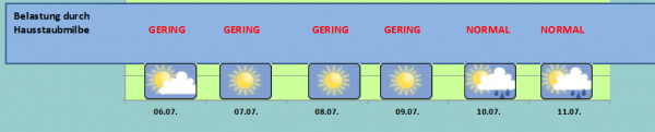 Im weiteren Wochenverlauf sind dann wieder häufiger Schauer und Gewitter möglich, die Hausstaubrisiken sind dabei als meist mäßig einzustufen.
