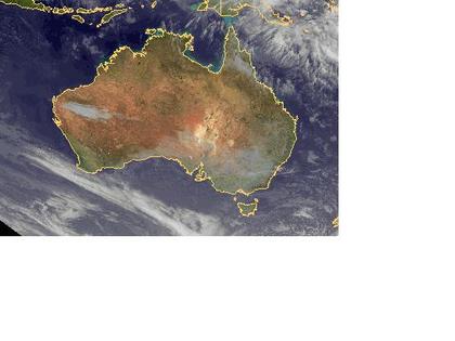 Auf dem Satellitenbild von Mittwoch früh sind über Australien nur wenige Wolken zu erkennen. Der größte Teil des Landes ist unter Hochdruckeinfluss wolkenfrei und trocken. Regen ist, wenn überhaupt nur im äußersten Südosten zu erwarten.