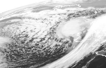 Der Ausschnitt zeigt sehr schön die beiden Strömungen, welche das Wolkenbild in der Nähe eines Tiefs ausmachen (die sogenannten Conveyor-Belts). Es ist deutlich die Grenze zwischen der Kaltfrontbewölkung über Irland und der Warmfront-Bewölkung nordwestlich davon auszumachen. Die beiden Wolkenbänder entstehen tatsächlich in völlig verschiedenen Luftmassen. Im Westen und Nordwesten zeigt sich die Quellwolkenstruktur in der kalten Luft.