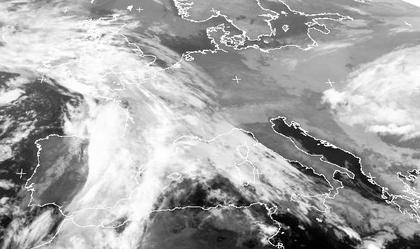 Auf dem Satellitenbild von Dienstag früh sind dichte Wolken über Frankreich und Spanien zu erkennen. Sie gehören zu den Ausläufern eines Tiefs bei den Britischen Inseln und werden morgen in Deutschland ein wenig Regen bringen. Auch im Osten Europas gibt es unter dichten Wolken etwas Regen. Dazwischen sorgt Hochdruckeinfluss für einen teils wolkenfreien Himmel.