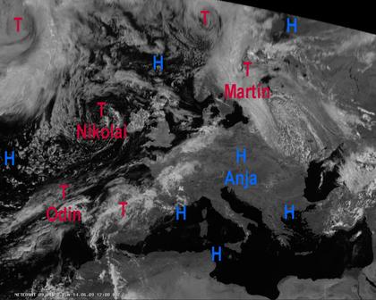 Das heutige Satellitenfoto zeigt unter dem Einfluss zweier Tiefdruckgebiete besonders im Norden Europas vielfach dichte Bewölkung. Hierbei kommt es häufig zu anhaltendem Regen. Gebietsweise kommt es aber auch auf der Iberischen Halbinsel, in Frankreich, in den Beneluxstaaten, im Norden von Großbritanien sowie im nördlichen Deutschland zu Schauern oder etwas Regen. Sonst ist es in Europa unter Hochdruckeinfluss meist heiter und trocken.