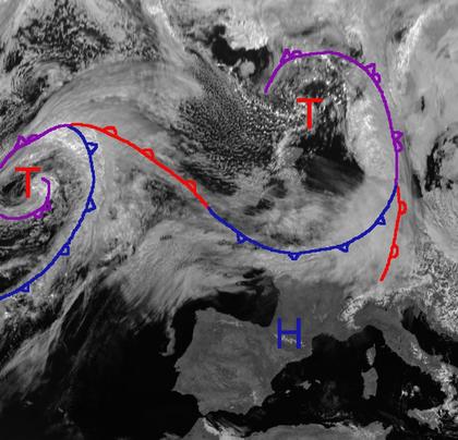 Tief 'Eckhard', das gestern noch über den Britischen Inseln lag, ist mit seinen Wolken heute nach Mitteleuropa gezogen und sorgt häufig für Regen. In seinem Gefolge kündigt sich auf den Atlantik bereits das Tief 'Franjo' an. Weiter nach Süden dagegen herrscht sonniges Wetter. Das Hoch wird sich weiter verstärken und sich etwas nach Mitteleuropa ausdehnen. Die Ausläufer von 'Franjo' werden somit nur in abgeschwächter Form nach Europa ziehen, können aber wohl noch etwas Regen bringen. Insgesamt jedoch bringt das Hoch den Frühling nach Mitteleuropa.