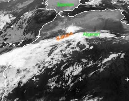 Auf dem Satelittenfoto zeigt sich ein kompaktes Wolkenpaket über Algerien bzw. über der nördlichen Sahara. In diesen Regionen kam es in den letzten Tagen zu ungewöhnlich starken und ergiebigen Niederschlägen, die vielerorts zu Überschwemmungen geführt haben. Der häufig ausgelaugte und sehr harte Boden kann zumeist kein Wasser aufnehmen, wodurch es im Regelfall zu oberflächlichem Abfluss und in diesem Beispiel zu teils extremen Überschwemmungen führt. Auch in den kommenden Tagen ist mit teils starken Niederschlägen zu rechnen.
