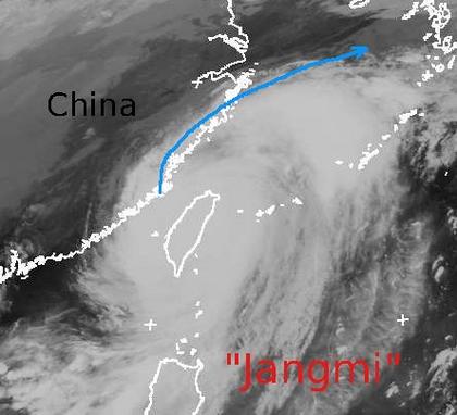 Taifun 'Jangmi' liegt heute mit seinen Wolken genau über Taiwan und bringt dort neben Sturm heftigen Regen. Der Wind erreicht 250 km/h im Mittel und bis zu 305 km/h in Böen. Er zieht nun noch etwas auf die Küste von China zu und schlägt dann aller Voraussicht nach eine nordöstliche Zugbahn auf Japan zu ein. Dabei schwächt er sich zunächst deutlich ab. (Bildquelle: Copyrigt EUMETSAT, NERC Satellite Receiving Station, University of Dundee)