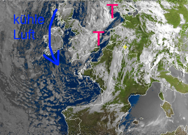 Über dem Atlantik und den Britischen-Inseln strömt kühle Nordmeerluf bis weit nach Süden. Diese trifft auf die feuchte und warme Luft über dem Festland und Mitteleuropa und verstärkt die Schauer- und Gewitterproduktion. Morgen erreicht die kühlere Luftmasse auch Deutschland und es kann zu teils kräftigen Regenfällen kommen. Es bestehen noch große Unsicherheiten, aber besonders Ostdeutschland, aber auch Rhön und Harz können bis Freitag 30-40 l/m2 Regen abbekommen.