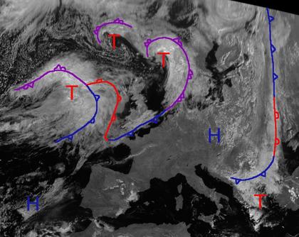 Während Hoch 'Ottilia' mit Zentrum über Tschechien verbunden mit einem Hoch bei den Azoren für wolkenarmes Wetter von Mitteleuropa bis zum westlichen und zentralen Mittelmeer sorgt, herrscht in den anderen Gebieten häufig Tiefdruckeinfluss mit dichten Wolken. So liegen über Nordwest- und Nordeuropa gleich mehrere Tiefs. Auch im Südosten zeigt sich ein Tief mit einigen Schauer- und Gewitterwolken.