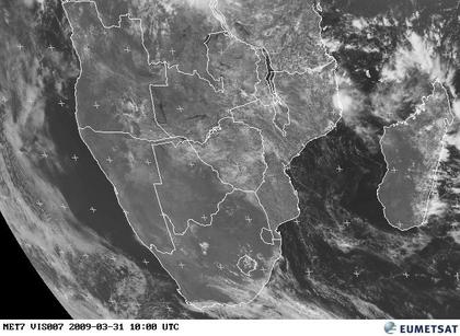 Auf dem heutigen Satellitenfoto zeigt sich der südlichste Teil Afrikas meist gering bewölkt oder wolkenlos. Entlang der Südküste Südafrikas halten sich dagegen teils dichte Wolken, die auch zeitweise etwas Regen bringen können. Ebenfalls mehr Wolken mit gelegentlich einzelnen Regenschauern sind im Norden und Osten Madagsakars und auf dem Festland, von der Atlantikküste Angolas über Sambia, Simbabwe bis zur Indikküste in Mocambique auszumachen.