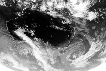 Über dem Norden des australischen Kontinents erkennt man noch tropische Schauer und Gewitter. Weiter im Süden findet man nur wenige Wolken. Ein Tiefausläufer bringt Regenwolken vom Südpolarmeer ins Landesinnere von Westaustralien. Im Südosten liegen nur an der Küste ein paar lockere Wolken. Auf der Tasmansee findet man aber das Zentrum eines Tiefs, das Regenwolken nach Neuseeland führt.