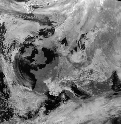 Hoch 'Isidor' sorgt für ein weitgehend wolkenfreies Gebiet von Irland und Westfrankreich bis nach Westdeutschland. Über Deutschland erkennt man aber auch an einem weiten helleren Bereich, wo das mittlerweile verschwundene Tief 'Yve' am Freitag und Samstag Schnee brachte.