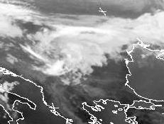 Die kleine Wolkenspirale ist ein Tief das sich über Rumänien gebildet hat. In ihm vermischen sich warme Luftmassen aus dem Mittelmeer mit kühleren aus dem Norden. Dabei kommt es zu einer labilen Schichtung in der sich verstärkt Schauer und Gewitter bilden.