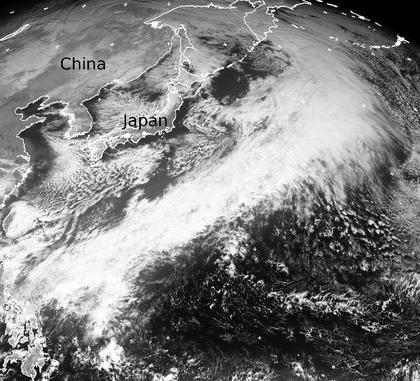 Im Pazifik östlich vor der Küste von Japan und China liegt ein Tiefdruckgebiet mit einem beeindruckend langem Wolkenband, dass sich über mehrere Tausend Kilometer vom Oskotischem Meer im Norden bis zu den Philippinen im Süden erstreckt. Es bringt teils kräftige Niederschläge und viel Wind, erreicht die Landmassen aber nur im Norden. In den nächsten Tagen zieht es nach Osten weiter, womit Japan und China von dem Tief nicht getroffen werden. (Bildquelle: Copyrigt EUMETSAT, NERC Satellite Receiving Station, University of Dundee)