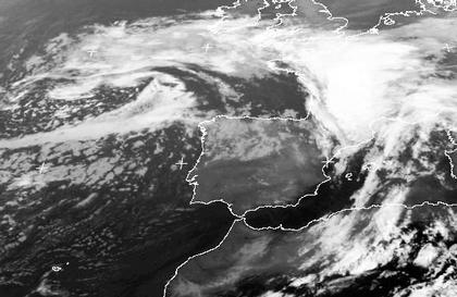 Der Ausschnitt zeigt das Tief südlich von Irland. Die beiden markanten Wolkenbänder über Frankreich und nordwestlich der protugiesischen Küste markieren die Grenzen der beteiligten Luftmassen.