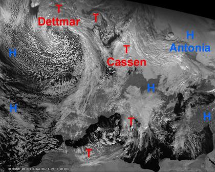 Auf dem heutigen Satellitenbild zeigt sich das kräftige Tief 'Dettmar', das heute mit teils kräftigen Schauer und teils auch Gewittern in Großbritanien wetterwirksam ist. Im übrigen West- und Mitteleuropa dominiert ebenfalls meist leichter Tiefdruckeinfluss, dabei kommt es aber meist nur zu einzelnen Schauern und häufig bleibt es auch trocken. In Osteuropa bleibt es unter Hochdruckeinfluss meist trocken, aber auch überwiegend trüb oder nebelig. Im Südosten Europas sowie in der Osthälfte de Mittelmeers ist es weitgehend heiter und trocken. Im westlichen Mittelmeerraum und vor allem an der Adria kommt es aber gebietsweise zu Schauern, vor allem an der Adria teils auch zu kräftigen Gewittern.