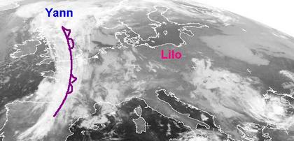 Während es in Osteuropa unter dem Einfluss des Hochs „Lilo“ weiter freundlich und wolkenarm bleibt, sorgen atlantische Tiefausläufer für Wolken und Schauer in Westeuropa. Von den Britischen Inseln bis nach Frankreich und Spanien erstreckt sich ein Wolkenband, er gehört dem Frontensystem des Tiefs „Yann“ nördlich von Schottland, am Montag erreichen Regenwolken auch Deutschland. Einige Schauer entwickeln sich auf dem Balkan, auf dem Satellitenbild erkennt man hier Haufenwolken.