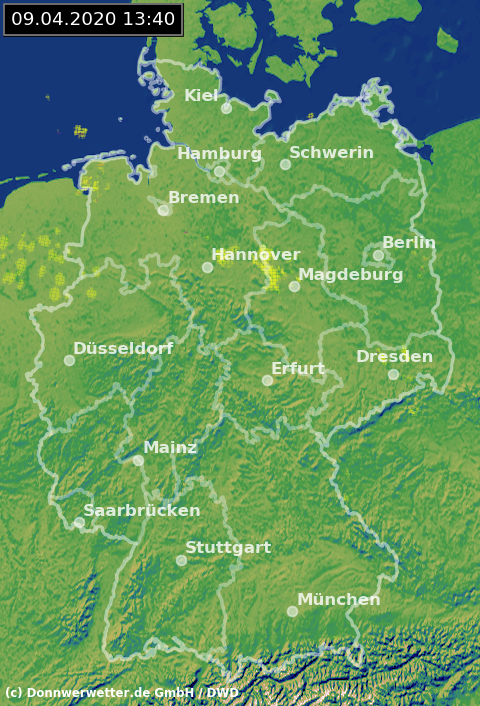 Das Radarbild von 13.40 Uhr zeigt keine signanten Signale, die auf Niederschlag deuten. Der Himmel über Deutschland präsentiert sich meistens heiter bis wolkig. Dabei bewegen sich die Temperaturen in der Nordhälfte zwischen 10 und 20 Grad, in der Südhälfte zwischen 20 und 26 Grad.