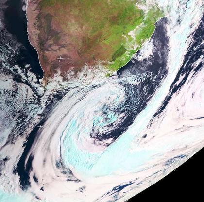 Ein Tiefdruckgebiet sorgt derzeit für unbeständiges Wetter an der Südküste Südafrikas, dabei fallen einzelne Schauer. Dabei bring ein starker Südwind ein Abkühlung mit sich. Es werden nur noch um 20 Grad erreicht.
