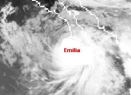 Der tropische Sturm 'Emilia' liegt derzeit vor der Küste der Halbinsel Kalifornien (Mexiko) im Pazifik. Dabei erreichen seine Windgeschwindigkeiten in Bön bis 150 km/h. Auf seinem Weg nach Nordwesten soll er aber weiter schwächer werden.