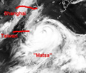 Der Taifun 'Matsa' im Ostchinesischen Meer hat sich weiter verstärkt und zieht zur Zeit mit Windgeschwindigkeiten von 160, in Böen 195 km/h weiter nach Nordwesten auf die Südsostküste von China zu. Berechnungen zufolge soll er heute östlich an Taiwan vorbeiziehen und am Samstag mit Windgeschwindigkeiten von 180, in Böen 212 km/h etwas südlich von Shanghai auf die chinesische Küste treffen und weiter nach Nordwesten ziehen.