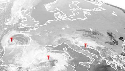 Drei Tiefdruckgebiete sorgen in Europa derzeit für Wolken und Regen, vor allem im Mittelmeerraum. Sonst sind weite Teile von Europa fast wolkenfrei. Hierfür sorgt das Hoch 'Orannia', das sich langsam von Skandinavien nach Russland verlagert. (Bildquelle: NERC Satellite Receiving Station, Dundee University, Scotland, http://www.sat.dundee.ac.uk/)