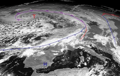 Tief 'Chanel' mit Zentrum bei Island zieht mit seinen Ausläufer heute von Westen rasch über Mitteleuropa hinweg. Dabei haben die Wolken heute Mittag den Osten Deutschlands erreicht. Weiter westlich sind die Wolken nicht mehr so dicht, sodass es in Westdeutschland schon wieder zu Auflockerungen kommt. Die Kaltfront des Tiefs erstreckt sich dabei quer über Frankreich bis nach Nordspanien und auf dem Atlantik hinaus. Auch morgen bestimmt Tief 'Chanel' in vielen Teilen Mittel- und Nordwesteuropas das Wetter. (Bildquelle: Copyrigt EUMETSAT, NERC Satellite Receiving Station, University of Dundee)