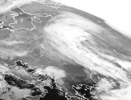 Der Ausschnitt zeigt das alte Tief 'Claus' über Osteuropa. Etwa vor einer Woche hat sich das Tief bei Norwegen aufgebaut und überquerte Westeuropa von Nord nach Süd. Über dem Mittelmeerraum hat es sich wegen des großen Temperaturunterschieds zwischen dem warmen Wasser und der kalten Luft wieder verstärkt. Am Freitag und Samstag sorgte das Tief für kräftige Niederschläge von Italien bis zum Balkan und dem Schwarzen Meer. Zurzeit liegt es über Osteuropa (auf dem Sattelitenbild erkennt man seine Kaltfront, sie erstreckt sich von Weißrussland bis zum Schwarzen Meer), und beeinflusst weiter das Wetter in Deutschland mit feuchtkalter Luft.
