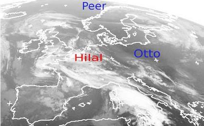 Auf dem Satelittenbild von heute Morgen sorgen die zu Tief 'Hilal' gehörenden teils dichten Wolken besonders über Frankreich und Italien für zahlreiche Niederschläge. Deutlich freundlicher ist es durch Hoch 'Otto' über Weissrussland vor allem östlich des Rheins bis nach Russland, sowie in Nordeuropa in Norwegen und Schweden.