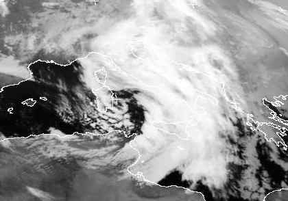 Der Ausschnitt zeigt das Tief 'Josef' über Italien. Innerhalb eines Tages hat es sich von einem Ausläufer des Atlantiktiefs 'Hans' entwickelt und bringt heute teils kräftige und gewittrige Schauer von Nordafrika bis nach Jugoslawien und Griechenland. Auf dem Sattelitenbild erkennt man sehr gut seine Kaltfront, die sich von den Alpen bis nach Tunesien erstreckt. Hinter ihr haben sich in feucht-kühler Luft bereits Schauerwolken zwischen Sardinien und der afrikanischen Küste entwickelt.