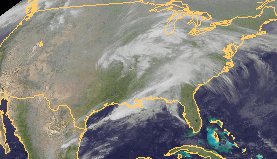 Ein Tief liegt mit seinen Wolken über der Osthälfte der USA, es zieht langsam zur Atlantikküste. Dabei kommt es verbreitet zu viel Regen. Über der Westhälfte des Landes finden sich dagegen unter Hochdruckeinfluss kaum Wolken.