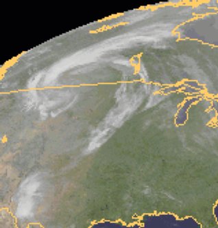 Mitten über dem nordamerikanischen Kontinent liegt derzeit ein kräftiges Tief, dessen Frontensystem sich gut im Wolkenbild abzeichnet. Die Kaltfront ist schon weit nach Osten vorgedrungen, sodass die Luft auf ihrer Rückseite aus Südwesten heranströmt und daher nicht mehr ganz so kalt ist. Vor allem aber strömt auf der Vorderseite des Tiefs sehr milde Luft nach Norden. Bis in den hohen Norden Kanadas geht dabei der Schneefall verbreitet in Regen über.