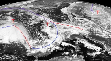 3 Tiefdruckgebiete bestimmen heute Europas Wetter. Dabei bringt Tief 'Nanni' über dem Baltikum Schnee bis nach Russland. Über den Britischen Inseln liegt Tief 'Petra', dessen Kaltfront für dichte Wolken und Regen von den Britischen Inseln bis nach Spanien und Portugal sorgt. Die Warmfront erstreckt sich quer über Deutschland, auch hier regnet, teils schneit es auch noch. Zwischen diesen beiden Tiefdruckgebieten ziehen viele Schneeschauer durch. Auf dem Atlantik nordwestlich vor Spanien liegt hingegen schon Tief 'Quintessa' bereit, es wird Deutschland voraussichtlich am Freitag Abend erreichen. Mit dem Tief gelangt deutlich mildere Luft nach Mitteleuropa. (Bildquelle: NERC Satellite Receiving Station, Dundee University, Scotland, http://www.sat.dundee.ac.uk/)
