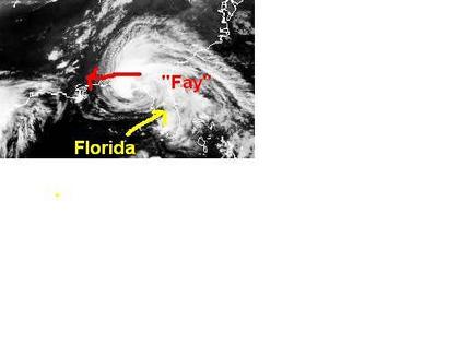Der tropische Sturm 'Fay' befindet sich auf dem Satellitenbild von Samstag früh noch über dem Nordwesten von Florida, hat sich aber etwas abgeschwächt. Zurzeit erreicht er mittlere Windgeschwindigkeiten von 85, in Böen 100 km/h. Berechnungen zufolge soll 'Fay' entlang der Küste weiter nach Westen ziehen und sich dabei weiter abschwächen. Es muss mit ergiebigen Regenfällen gerechnet werden. (Bildquelle: NERC Satellite Receiving Station, Dundee University, Scotland, http://www.sat.dundee.ac.uk/)