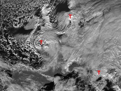 Tiefdruckgebiete sorgen vor allem im Norden und Osten von Europa für dichte Wolken mit Schnee. Im Südwesten sind auch größere Wolkenlücken zu erkennen. Dabei sind auf dem Satellitenbild von Mittwoch Mittag die Schneefelder der Alpen und der Pyrenäen gut auszumachen.
