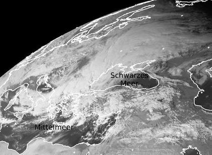 Westlich und nördlich des Schwarzen Meers liegt heute Mittag ein ausgedehntes Wolkenband. Es gehört zum Tief 'Irmela', das gestern in Deutschland den Winter brachte. Von Süditalien bis nach Russland regnet oder schneit es aus den Wolken teils ergiebig. Von Norden fließt dabei zunehmend auch kalte Luft ein. Bis morgen kommen die Ausläufer des Tiefs noch weiter südostwärts voran und erreichen dann die Türkei. (Bildquelle: Copyrigt EUMETSAT, NERC Satellite Receiving Station, University of Dundee)